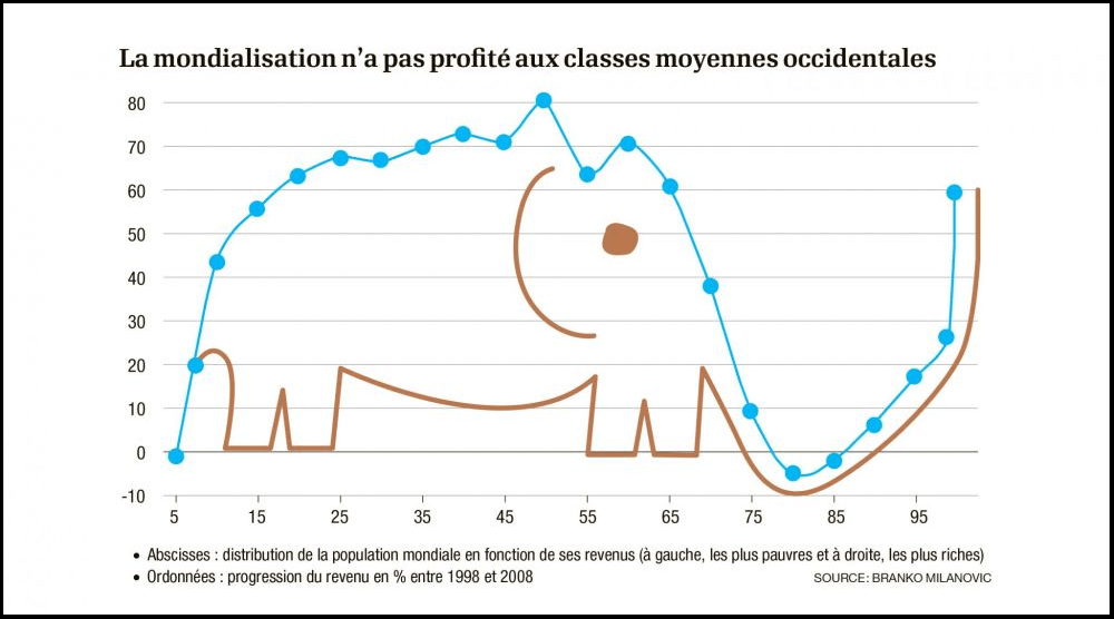 Puis la courbe chute violemment le long de la tête de l’éléphant. Ce sont les grands perdants de la mondialisation, c’est-à-dire les classes moyennes des pays de l’OCDE (Europe et Amérique du Nord). Pour certains, le salaire a même diminué puisque la courbe passe sous l’axe des abscisses. Ce qui amène certains Kconomistes à s’interroger : et si la classe moyenne n’était qu’une aberration Nékonomique ponctuelle associée aux Trente Glorieuses et à la reconstruction d’après-guerre ?