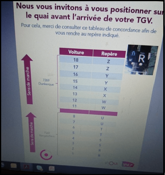 « Regardez sur ce panneau derrière, il y a une Table de Correspondance… Vous voyez ? Pour les TGV courts, les voitures 1 à 3 du train correspondent aux repères A à D du quai, les 4 et 5 aux repères E à F, les 6 et 7 aux repères G à J… C’est simple et facile non ? »…