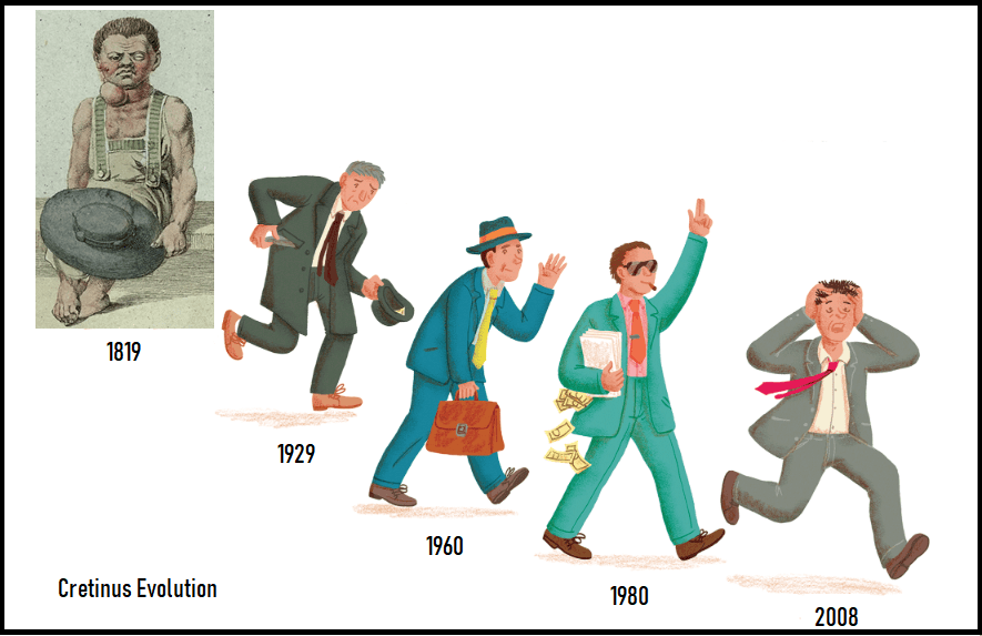 Le Crétin a connu son heure de gloire au XVIIIème siècle. Les voyageurs, qui s’aventuraient dans les montagnes, témoignent de leurs rencontres avec des Zêtres simplets, au front bas et à la mimique inexpressive. Son infantilisme se poursuit tout au long de sa vie, détaille un médecin. Avec l’explosion des sports d’hiver, le Crétin des Alpes, ambitieux et arrogant, a trouvé refuge auprès de la Crétine des Villes. Ils se marièrent et eurent beaucoup d’enfants : les Alphas Plus et les Bêtas Plus qui peuplent aujourd’hui les mégalopoles mondialisées…