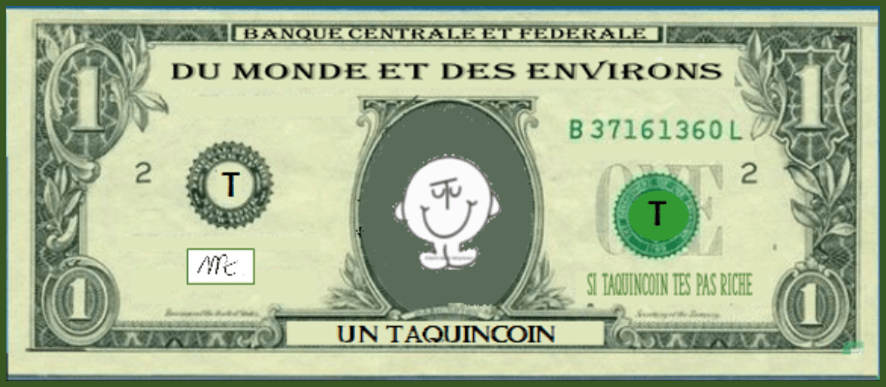 En 2020, Monsieur T profite de la crise du Covid Jaune pour créer aussi son propre Coin : le Taquincoin (CTonQ). Totalement opaque dans son fonctionnement, le Taquincoin a été inventé pour lutter contre le monopole et les dérives des Banques Centrales. Le Taquincoin est une monnaie vertuelle – verte, vertueuse et virtuelle – fondée sur la Mémoire du Vent, ce qui lui confère une valeur intrinsèque incalculable.