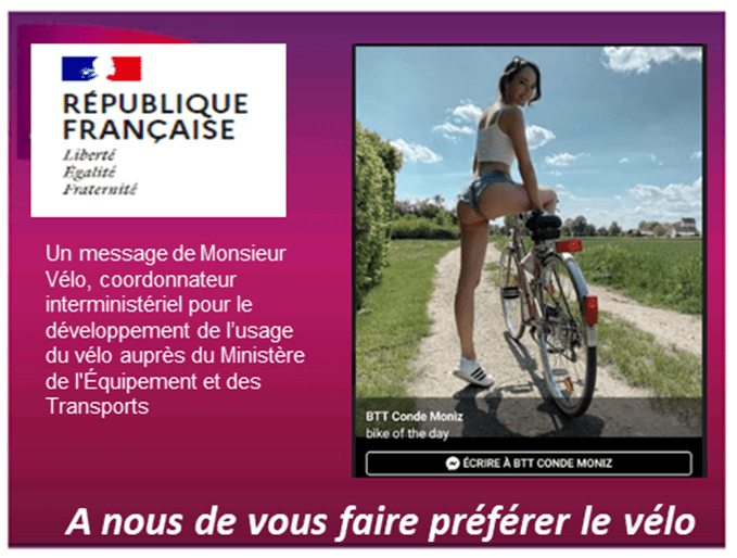 Mon vélo connecté : En salle ou dans la ville, le vélo est connecté… à Monsieur Vélo. En effet, Thierry du Crest, ingénieur en chef des ponts, des eaux et des forêts, a été nommé coordonnateur interministériel pour le développement de l’usage du vélo et des microshorts par décret du Président de la République en date du 12 septembre 2019.