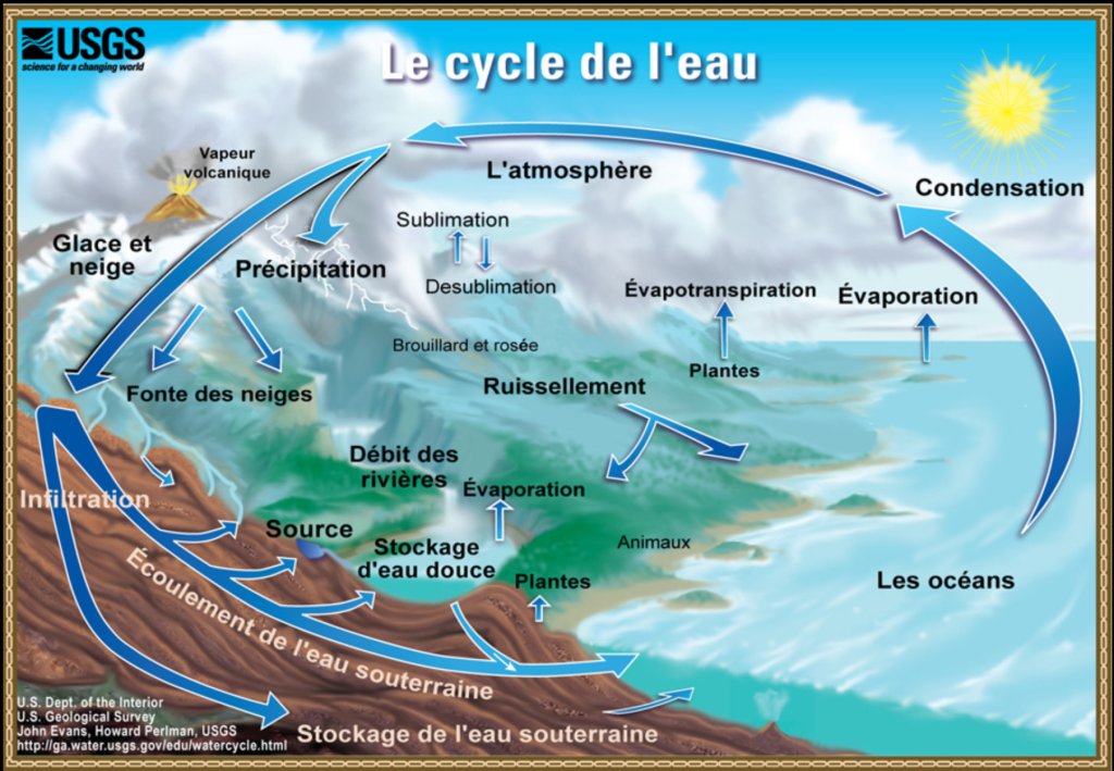 Cycle de l’eau : Le cycle de l’eau, également connu sous le nom de cycle hydrologique, est le processus naturel par lequel l’eau se déplace et se recycle continuellement à travers la Terre.